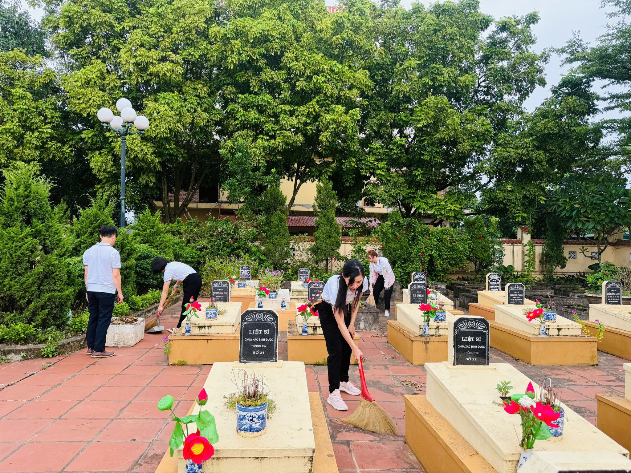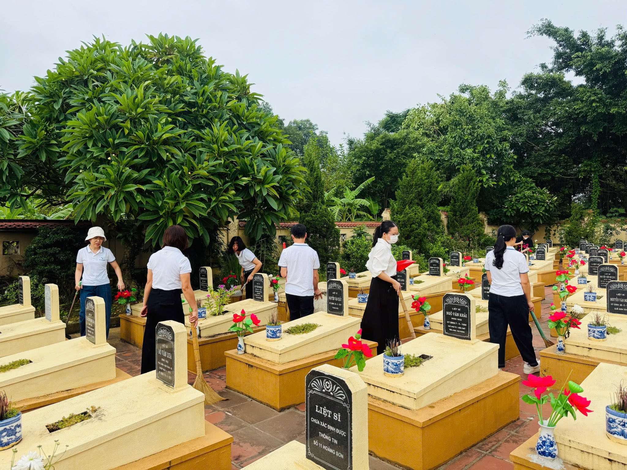 Với sự thành kính và tri ân, các thầy cô giáo cùng các em học sinh đã dọn vệ sinh, nhổ cỏ, lau bia đá và chăm sóc cây xanh, góp phần giữ gìn không gian ở nghĩa trang thêm trang nghiêm và sạch đẹp.