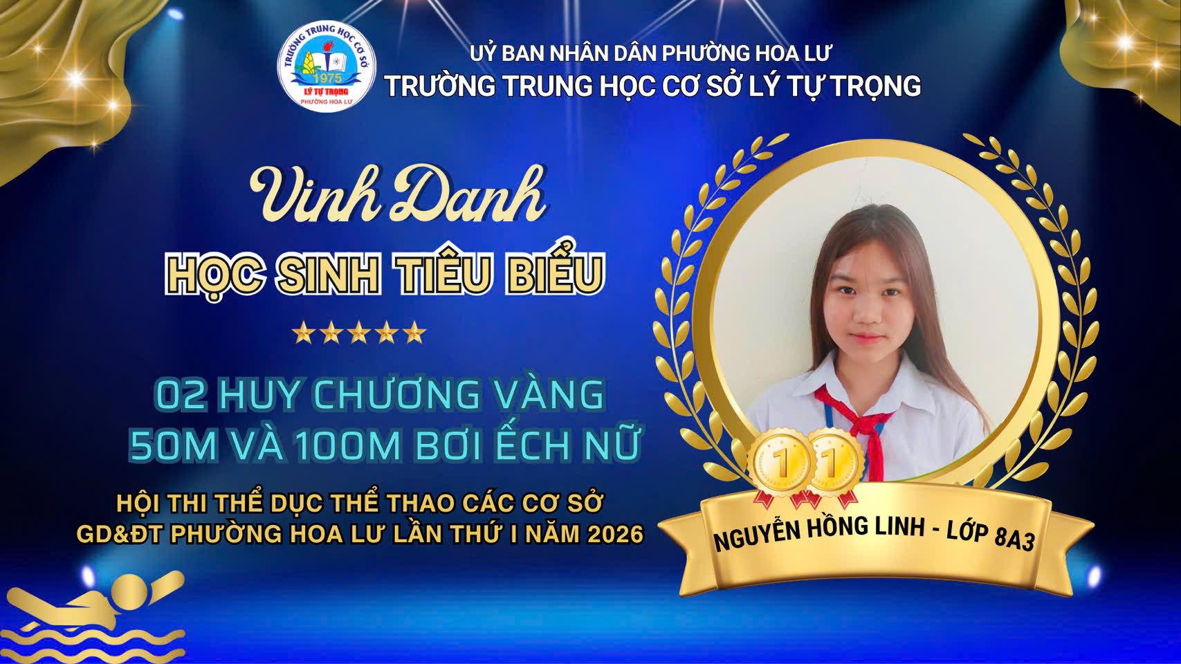 5. Em Nguyễn Hồng Linh – lớp 8A3 2 HCV nội dung 50m và 100m bơi ếch nữ.