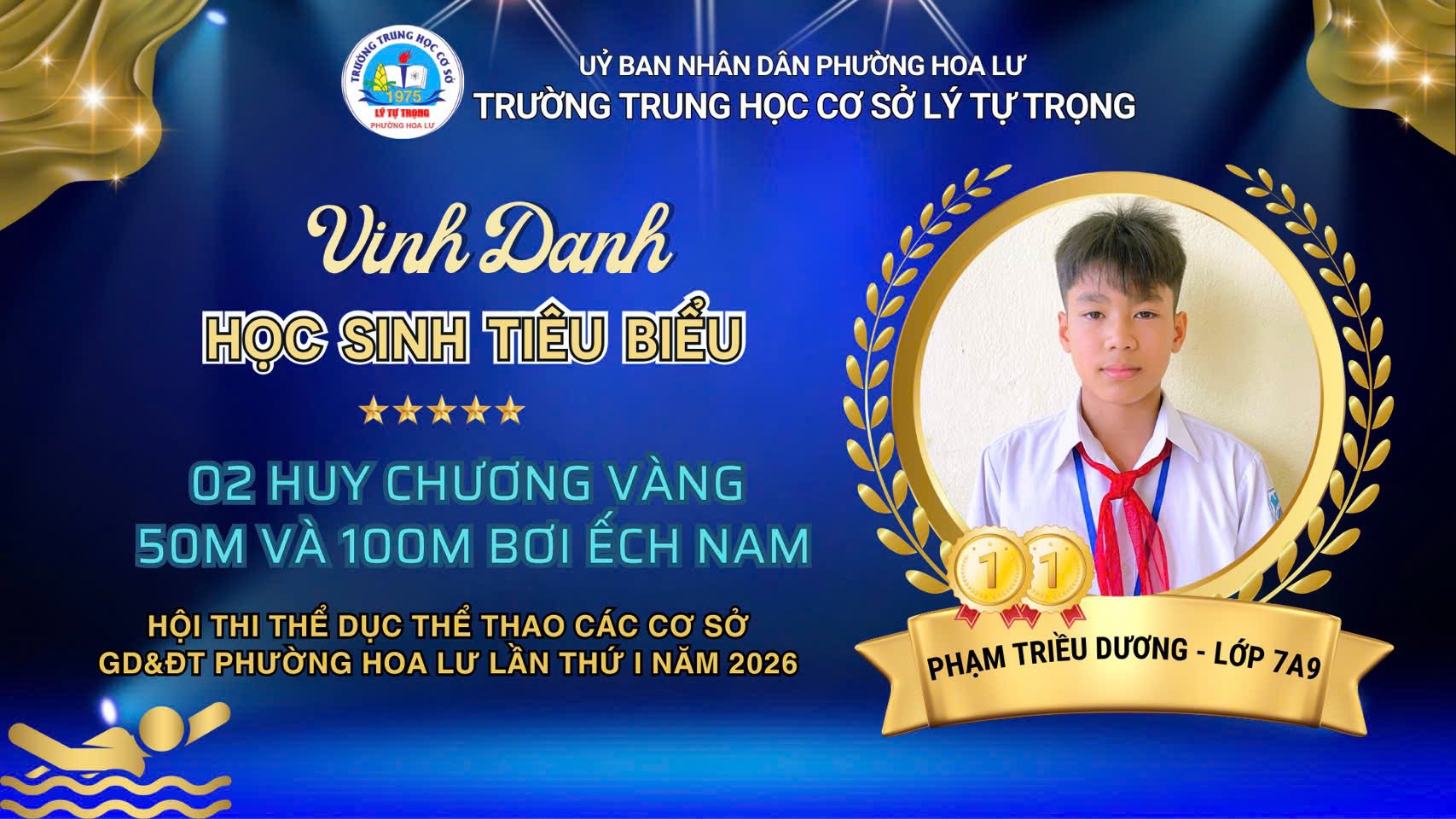 6. Em Phạm Triều Dương – lớp 7A9 2 HCV nội dung 50m bơi ếch và 100m bơi ếch.