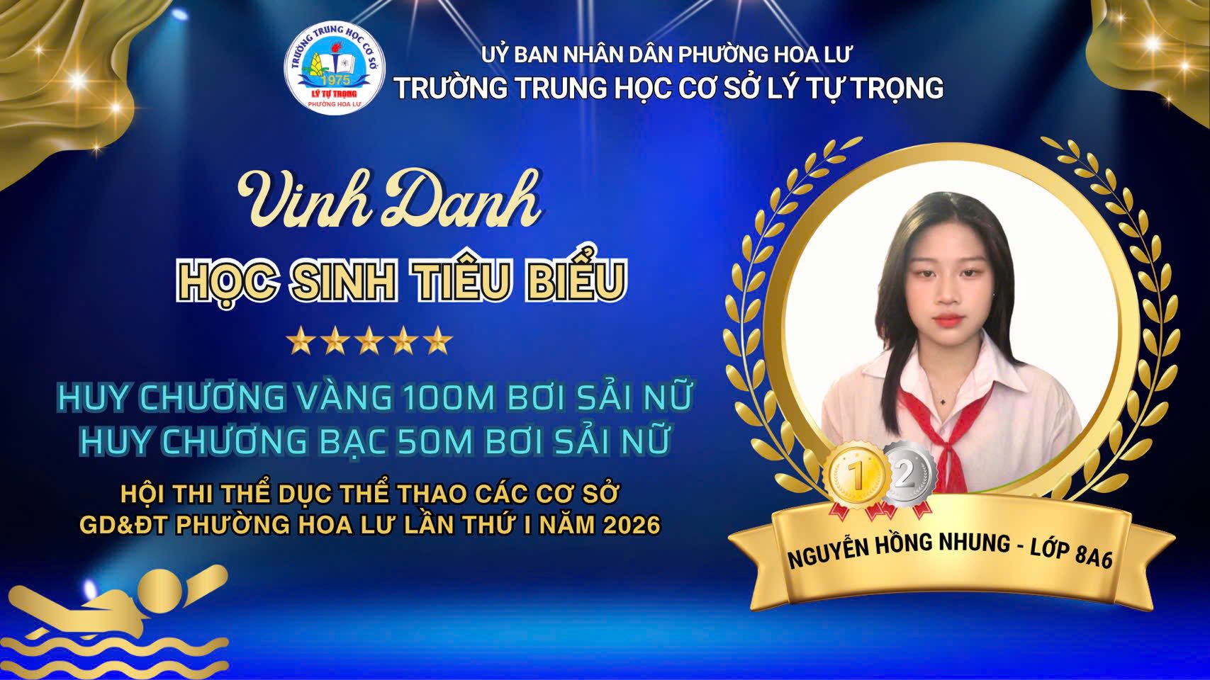8. Em Nguyễn Hồng Nhung – lớp 8A6 HCV nội dung 100m bơi sải nữ.
